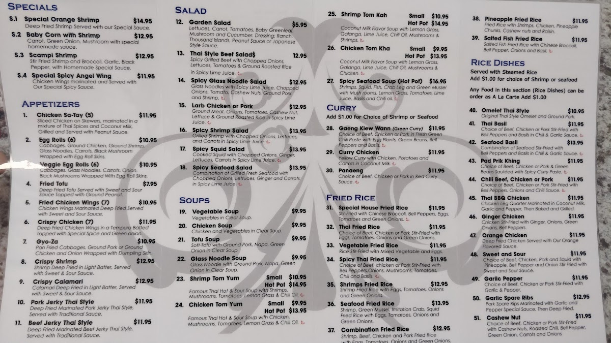 The menu is a delightful tapestry of flavors, with something to satisfy every palate. Start your culinary adventure with their Special House Fried Rice, which is a symphony of color and taste, or dive into a plate of Pad Thai, where tender noodles intertwine with generous portions of shrimp or chicken, all tossed in a tangy sauce that dances on your taste buds. For something a little different, the Pineapple Fried Rice combines sweet and savory in every bite, making it a standout choice.